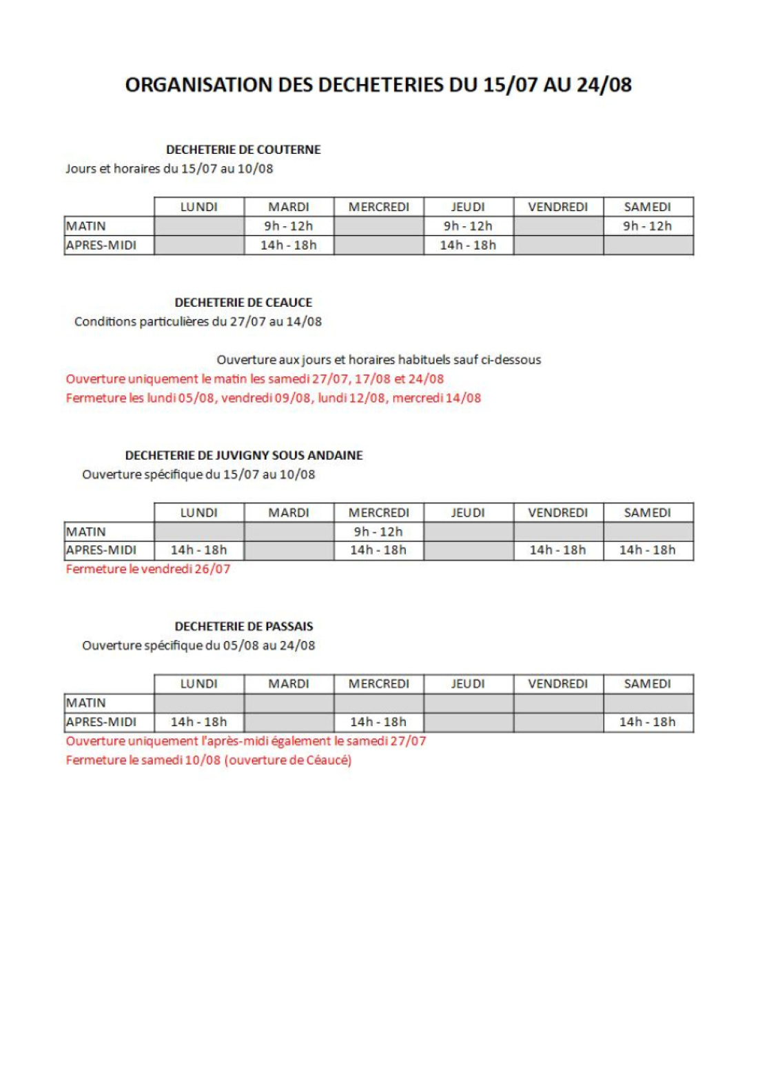 Horaires d’ouverture de la déchetterie de Céaucé : Lundi / Mercredi 14h -16h45, Jeudi 10h -11h45, vendredi 14h -16h45, Samedi 9h -12h / 14h - 16h45.