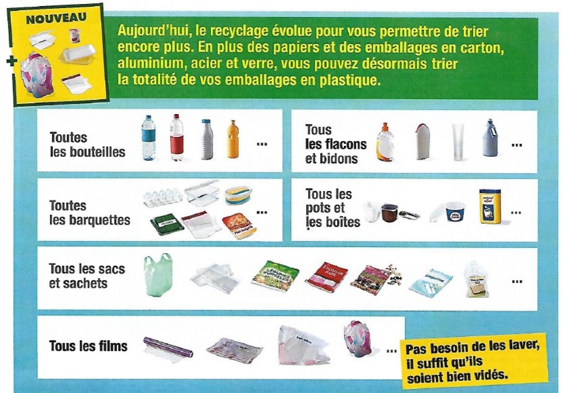 Avec l’apport des nouvelles matières, TOUS LES EMBALLAGES ALIMENTAIRES EN PLAS-TIQUE, les apports de la collecte sélective seront plus importants. Actuellement il n’y a qu’une co-lonne plastique et souvent pleine. Un second conteneur sera positionné à l’espace de tri.